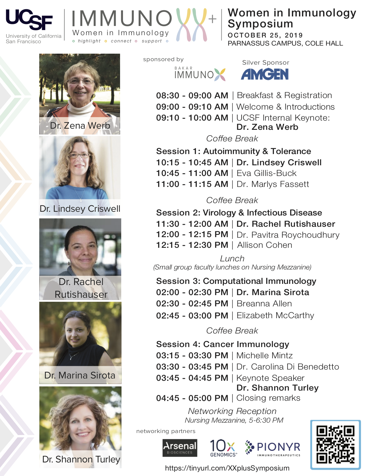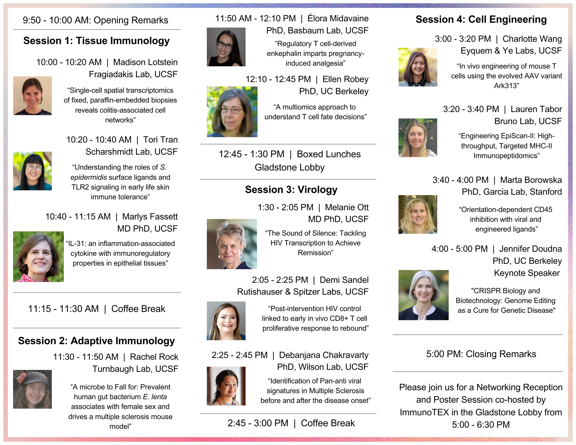 The Gender Equity in Immunology Symposium was founded in 2018 to highlight exceptional scientists who may identify as gender minorities within the UCSF Immunology Program. We designed the symposium to incorporate research talks from established faculty and trainees who are earlier in their career to demonstrate the diversity of labs and research at UCSF. Now as a yearly forum, the symposium additionally provides a scientific platform for discussions on gender disparities in and beyond our community.
