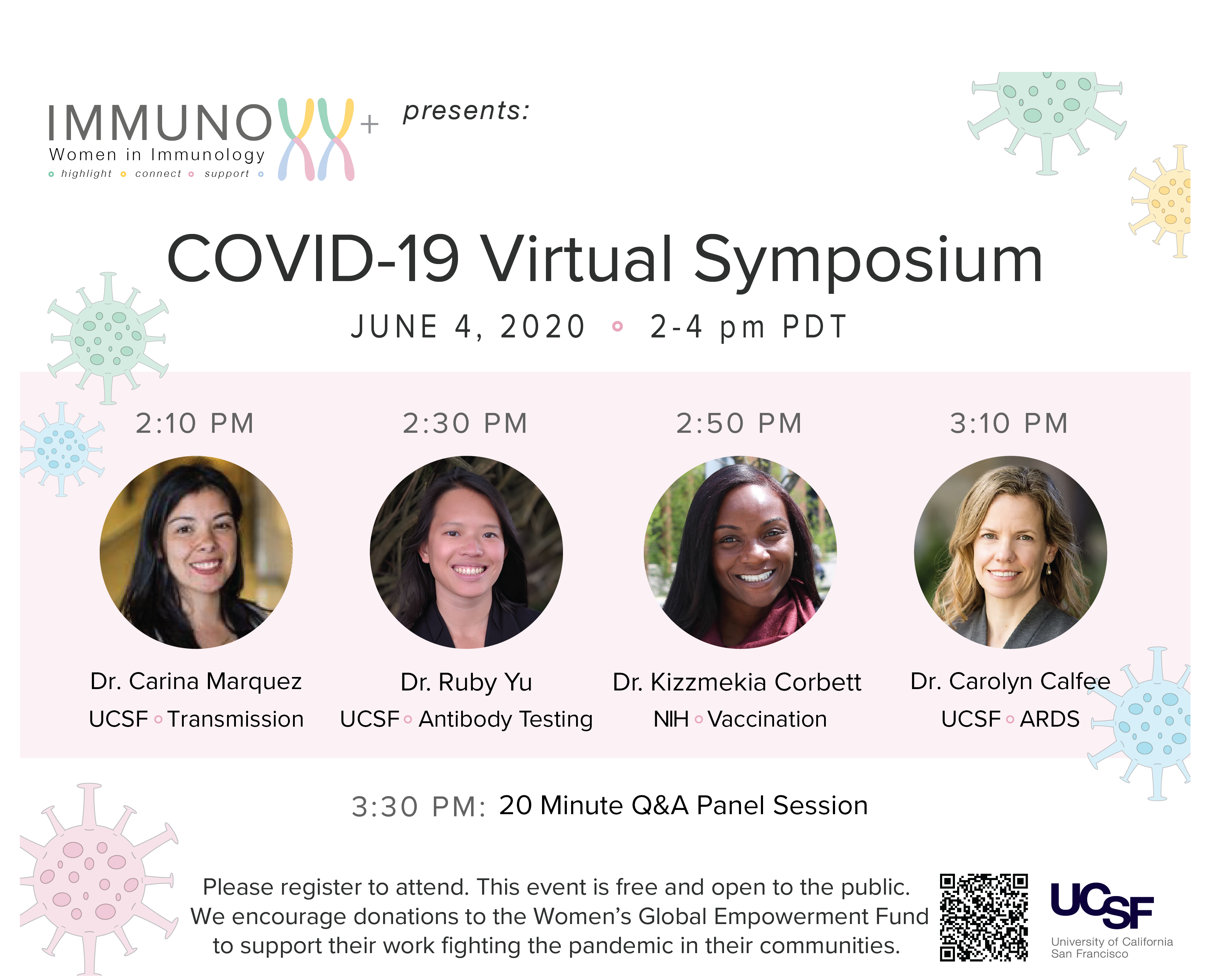 Event Details: Guided by our mission to highlight, connect and support female scientists, ImmunoXX+ is hosting a COVID-19 Mini Symposium to showcase the current COVID-19 research efforts of 4 incredible female scientists. We will hear presentations from Drs. Carina Marquez, Ruby Yu, Kizzmekia Corbett, and Carolyn Calfee about topics ranging from viral transmission to the current state of antibody testing. The symposium will conclude with a 20-minute Q&A session. Throughout this event we are encouraging participants to donate to our sponsored partner, the Woman’s Global Empowerment Fund, who is working to prepare and equip local communities in Uganda to fight the COVID-19 pandemic.