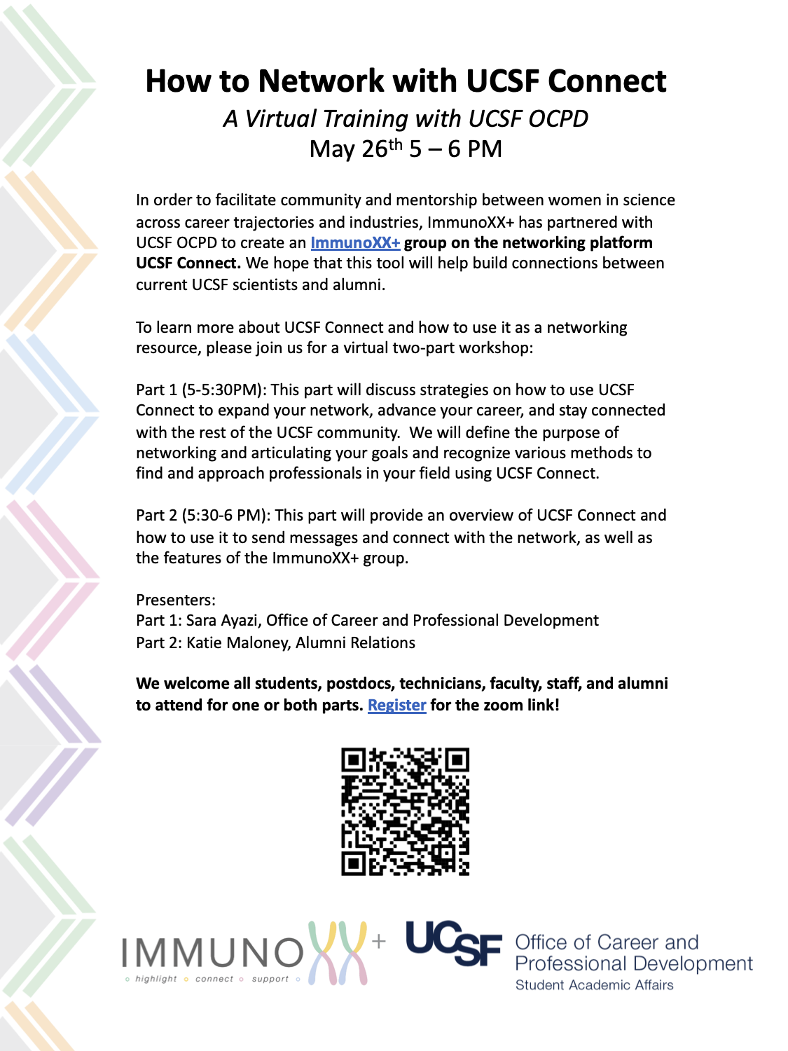 Event Details: To facilitate community and mentorship between women in science across career trajectories and industries, ImmunoXX+ has partnered with UCSF OCPD to create an ImmunoXX+ group on the networking platform UCSF Connect. We hope that this tool will help build connections between current UCSF scientists and alumni. During this two-part workshop, we will be going over the UCSF Connect platform, features of the ImmunoXX+ group, and strategies on how to best use UCSF Connect to expand your network. Join us for one or both parts of the session.