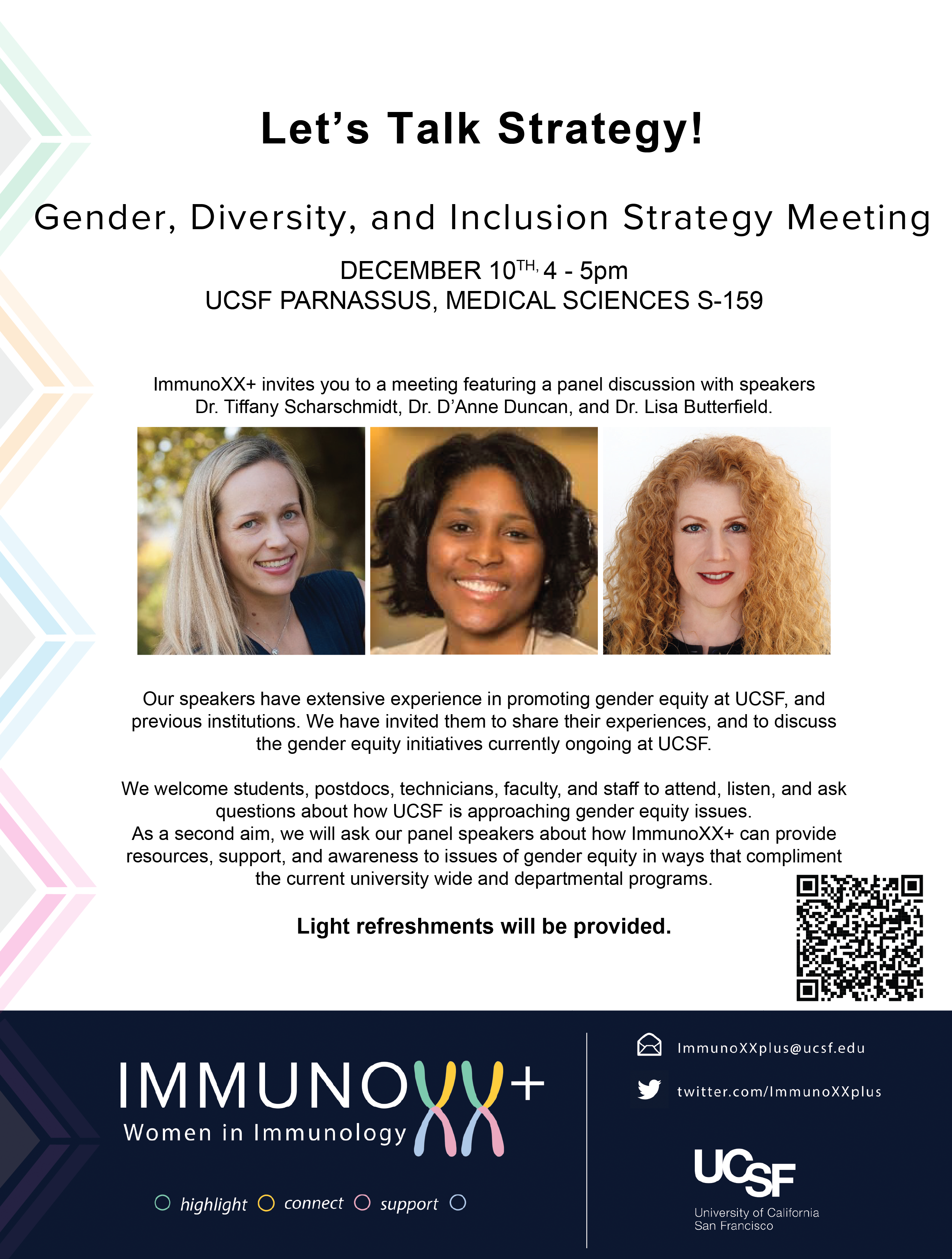 Event Details: ImmunoXX+ presents a Gender, Diversity and Inclusion strategy meeting featuring guest speakers Dr. Tiffany Scharschmidt, Dr. D'Anne Duncan, and Dr. Lisa Butterfield. Our speakers have extensive experience in promoting gender equity at UCSF, and previous institutions. We have invited them to share their experiences, and to discuss the gender equity initiatives currently ongoing at UCSF. We welcome students, postdocs, technicians, faculty, and staff to attend, listen and ask questions about how UCSF is approaching gender equity issues. As a second aim, we will ask our pane speakers about how ImmunoXX+ can provide resources, support, and awareness t issues of gender equity in ways that complement the current university wide and departmental programs.